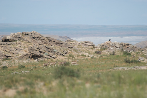 I saw this large group at Ikh Nartiin Chuluu in 2008; seventeen animals, I think, and they ran up that vertical cliff like water flowing uphill