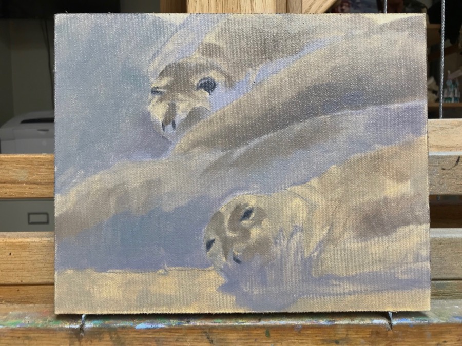 Then it’s a matter of refining the shapes, their colors and getting the value relationships right. One change I made between the one above and the one below was to add the tail flippers from a seal in another location to the lower left corner. It felt like something was missing and that the viewer’s eye might easily exit the painting there. And it added a third (uneven number) point of interest besides the heads.