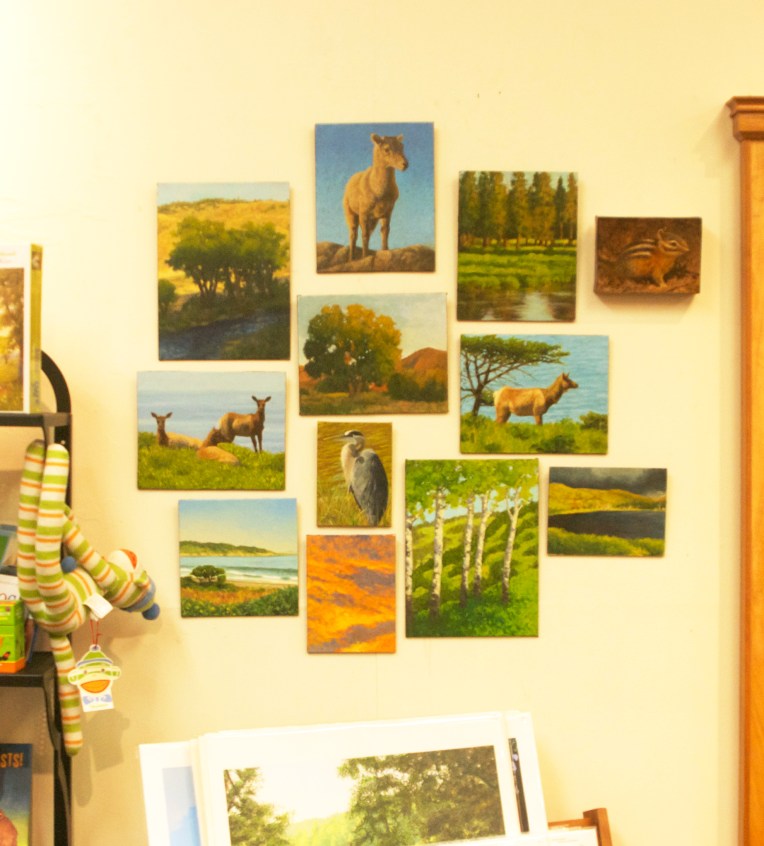 Last but not least, I am pleased to announce that Plaza Design, with stores in Eureka, Arcata and McKinleyville, is now offering a large selection of my small, original oil paintings! There’s a little bit of everything, including landscapes and American wildlife. They will be offering a selection of my greeting cards, too.