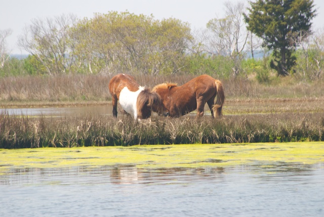 First we saw this chestnut horse grazing off in the distanceThen this paint horse came strolling down the middle of the road right past usHe walked out to the edge of the waterAnd waded across to the spitHe winnied loudly a few times and then waitedThe chestnut we'd seen earlier came at a fast trotThe two stopped and seemingly sized each other upThe meetingThe nose touchA quick turn and a kick by one of themThen they would rear up and "grapple"Maneuvering for advantageBoth would go down on their knees head to headAnd then it would start againAnd it all happened in this tremendous setting of water and tideland