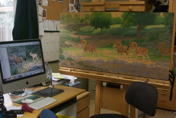 My work set-up. Since I use my iMac to view my images, it's also handy for doing quick marketing tasks when I take a break. But I make sure I get my painting time in every week.